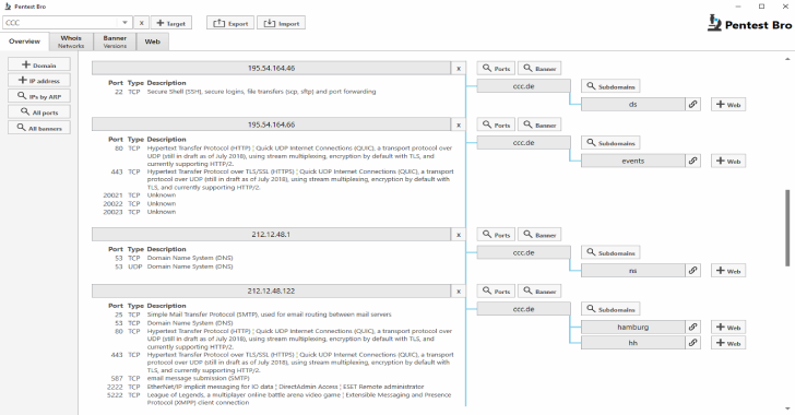 Experimental tool for Windows. PentestBro combines subdomain scans, whois, port scanning, banner grabbing and web enumeration into one tool. Uses subdomain list of SecLists. Uses nmap service probes for banner grabbing. Uses list of paths for web enumeration.