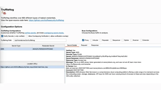 - Automatic Secret Detection: The extension runs TruffleHog every 10 seconds to scan HTTP traffic from various Burp Suite tools like the proxy, repeater, and intruder. It writes this traffic to a temporary directory, scans it for secrets, and then deletes the files.