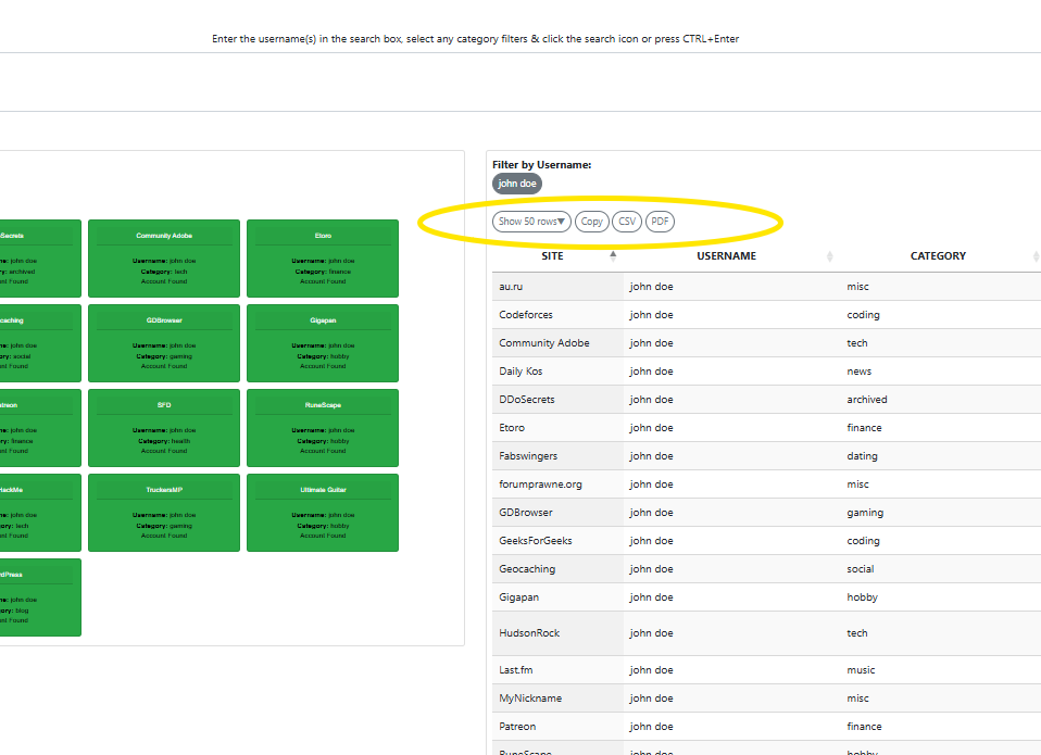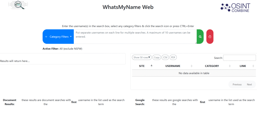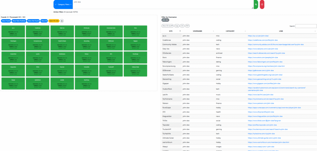 Enter a single username or a comma-separated set of handles into the main search field. For broad reconnaissance, start with the default settings to scan the full directory of supported platforms. When you need to narrow the scope, use the category filter to focus on specific buckets such as social, business, gaming, developer, or dating networks.